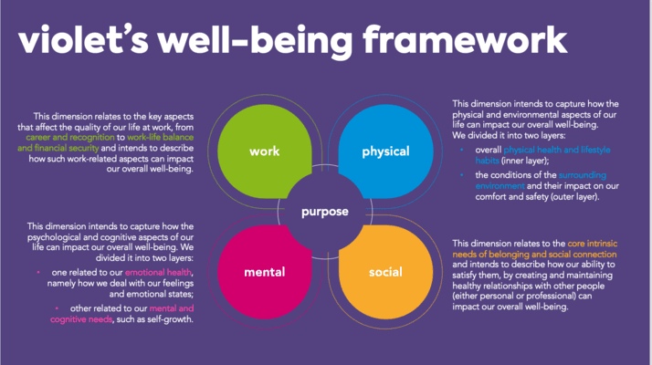 And so, from our research and analysis of existing frameworks and predictors, we’ve drafted violet’s well-being model considering 4 main attributes – physical, mental, social and work – connected through a fifth dimension: purpose.